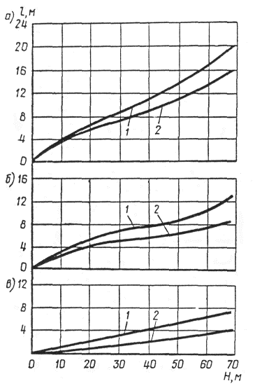 Рис.4. Схема распределения гидростатического давления воды при частичном затоплении отсека: l - уровень воды 3.28. При наличии дополнительного нагружения откосов внешними силами (например, тяжелым оборудованием) его соответствующим образом учитывают, суммируя с собственным весом блоков (после разложения на удерживающие и сдвигающие составляющие в плоскости смещения того отсека, на поверхности которого они приложены). 3.29. В случаях, когда инженерно-геологические условия удовлетворяют одновременно нескольким расчетным схемам, определение общей устойчивости осуществляется по каждой из них и за окончательный вариант принимается тот, по которому получено наименьшее значение устойчивости. 3.30. При наличии в откосах слабых прослоев, расположенных на различных участках по его высоте, необходимо осуществлять дополнительную проверку общей устойчивости, ориентируясь на возможность прохождения поверхностен обрушения через указанные прослойки (применительно к одной из схем рис. 1). 3.31. Допускается проектировать без расчетов: откосы крутизной 1:0,2 - 1:0,5 при высоте их до 20 м в крупноблочных (l0 ≥ 0,5 м) слабовыветривающихся скальных породах, относящихся к группе I (приложение 6), при благоприятном расположении поверхностей ослабления; откосы крутизной 1:1,25 - 1:1,5 при высоте их до 12 м в легковыветривающихся размягчаемых скальных породах, относящихся к IV-V группам (см. приложение 6). Расчет местной устойчивости3.32. Для расчета местной устойчивости необходимо грунты, слагающие откосы и склоны, классифицировать по их устойчивости к выветриванию во времени в соответствии с методикой, изложенной в приложении 6 [33]. 3.33. Расчет местной устойчивости для грунтов I-III и IV-V групп (см. приложение 6) следует осуществлять по двум методам, что обусловливается разным характером выветривания грунтов этих групп под воздействием природных факторов [33; 40-43]. Грунты I-III групп после вскрытия массива практически не выветриваются или же выветриваются, преимущественно до состояния каменисто-щебенисто-дресвяных фракций; грунты IV-V групп выветриваются до состояния глинисто-пылевато-песчаных фракций. Грунты IV-V групп характеризуются повышенной интенсивностью выветривания во времени и отличаются значительной мощностью выветрелой зоны, в пределах которой в перспективе их можно считать рыхлыми грунтами. Поэтому на грунты IV-V групп при расчетах устойчивости (как общей, так и местной) распространяются те же рекомендации, которые приняты для рыхлых грунтов. 3.34. Расчет местной устойчивости для грунтов I-III групп сводится к определению интенсивности поступления продуктов выветривания (объема осыпи) с единицы поверхности откоса и величины отступления бровки откоса во времени [33, 34]. 3.35. Проверка местной устойчивости откосов и склонов в. грунтах IV-V групп заключается в определении возможности образования на них поверхностных сплывов выветрелого до состояния мелкозема грунта [33]. Параметры, требуемые для оценки устойчивости3.36. Основными параметрами при расчетах общей устойчивости, откосов являются: φтр, Стр, φк, С, См, l0, γ0 (cм. табл. 1 и 3). При расчетах местной устойчивости необходимо дополнительно определять: I -интенсивность осыпания продуктов выветривания с 1 м2 поверхности откоса; Кр - коэффициент разрыхления, в среднем равный 1,50. Методика определения расчетных параметров приве