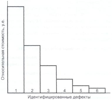 9.4 РанжированиеПрименение метода Парето для отделения «жизненно важного» от «тривиального» позволяет выделить самый высокий вклад в любую совокупность данных. Результаты могут быть ранжированы и изображены в графическом виде для лучшего понимания. Пример - Рисунок 2 иллюстрирует относительную стоимость дефектов в электробытовых приборах специального вида. По методу Парето установлено, что наиболее серьезной проблемой является нарушение функционирования мембранных выключателей. Очевидно, что для достижения значительного сокращения затрат необходимо уменьшить сферу распространения отказов мембранных выключателей. Проводят выявление причин дефекта мембранных выключателей. Назначают группу специалистов для идентификации причин и отнесения их к одной из следующих пяти выбранных категорий: а) конструкция/спецификации; б) материал; в) оператор; г) оборудование; д) метод. Выявленные дефекты: 1- нарушение функционирования (отказы) мембранных выключателей; 2- задиры в обработанных отверстиях; 3- отломанные контактные выводы; 4- отверстие не вырезано; 5- образование ямок (при травлении) на обрабатываемых поверхностях; 6- прочие.