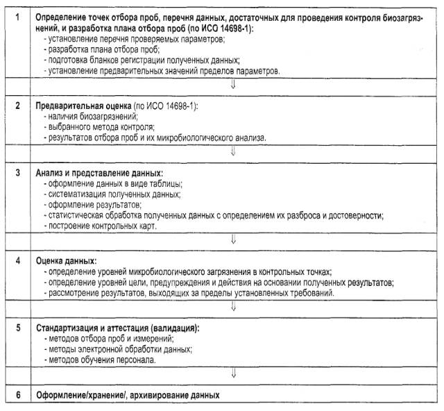 Рисунок 1 - Анализ данных, полученных при первоначальном контроле Важно обеспечить надежную защиту данных и протоколов, в т. ч, данных, хранящихся в компьютере. 4.3. Анализ данных, полученных при текущем контроле (рисунок 2) 4.3.1. Отбор проб и обращение с ними Методы отбора проб приведены в ИСО 14698-1. Отбор проб является самым важным этапом в получении достоверных результатов, В дополнение к этому лаборатория должна иметь четкие инструкции по маркировке проб и работе с ними, в т.ч. по приемке, выполнению всех аналитических операций до получения конечных результатов и правильной идентификации этих результатов с исходной пробой. 4.3.2. Сбор данных Следует руководствоваться общими указаниями по составлению плана отбора проб, приведенными в ИСО 14698-1, В дополнение к этому, во избежание регистрации ошибочных результатов, необходимо учитывать следующие факторы: особенности области применения; - определение параметров, характерных для этой области применения; - точки отбора проб в технологическом процессе/системе; - пределы обнаружения и чувствительность тест-системы; - порядок сбора данных в процессе эксплуатации.