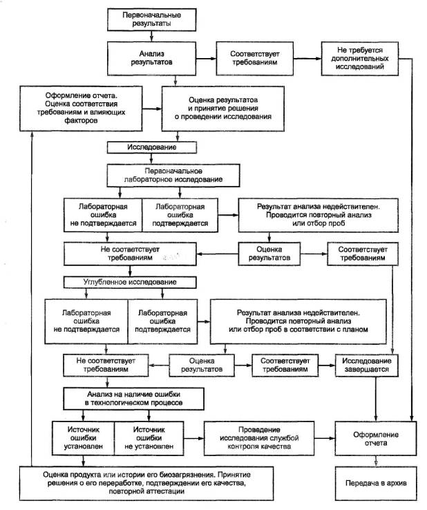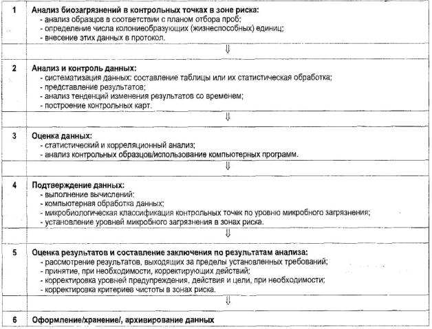 ||3.10 опасность (hazard): По ИСО 14698-1. 3.11. риск (risk): По ИСО 14698-1 (Руководство ИСО/МЭК 51, 3.2). 3.12. зона риска (risk zone): По ИСО 14698-1. ||3.13 целевой уровень (target level): По ИСО 14698-1. 3.14. валидация (validation): По ИСО 14698-1 (ИСО 9000, 3.8.5). 3.15. жизнеспособная частица (viable particle): По ИСО 14698-1. 3.16. жизнеспособная единица (viable unit, VU): По ИСО 14698-1. Примечание: В случаях, когда количество жизнеспособных единиц определяется как число колоний на агаровой питательной среде, их называют, как правило, колониеобразующими единицами (КОЕ). Одна КОЕ может состоять из одной или более жизнеспособных единиц 4 Анализ данных о биозагрязнениях4.1. Общие положения В ИСО 14698-1 приведены рекомендации по установлению уровней действия, предупреждения и, при необходимости, целевых уровней, аттестации (валидации) методов подсчета и интерпретации данных о биозагрязнениях. Настоящий стандарт устанавливает методы анализа полученных данных. При обработке результатов микробиологического контроля в зонах риска требуется учитывать следующие факторы: - вид получаемых данных; - необходимую информацию - методы обработки полученных данных (например, статистические методы, корреляционный анализ, использование компьютерных программ и пр.); - систематизацию данных с целью обнаружения существенных тенденций и отклонений; - вид представления полученных результатов (например, качественный, количественный, графический, цифровой) и единицы измерения; - воспроизводимость данных и проблемы, связанные с применением аналитических методов; - анализ тенденций; - контрольные карты; - оценку, интерпретацию и оформление результатов. Оценку результатов целесообразно выполнять в два этапа: при первоначальном контроле (вводе оборудования в эксплуатацию) и при текущем контроле. 4.2. Анализ данных, полученных при первоначальном контроле (рисунок 1) 4.2.1. Достоверность данных о биозагрязнениях - Для того чтобы получить достоверную оценку уровня биозагрязнений, исходя из данных, полученных по ИСО 14698-1, требуется учитывать следующие факторы: - достаточное число отобранных проб, их однородность и точность разведения, если эта операция применяется; - состав микроорганизмов, выявляемых в жизнеспособных частицах, его изменение во времени, влияние стресса и повреждения на выживаемость и выявление; - результаты, получаемые в различных местах отбора проб в зонах риска или в других контролируемых зонах; - методы культивирования и подсчета; - выбор метода анализа и соотношение между прямыми и косвенными параметрами, определяемыми при испытаниях. 4.2.2. Корректирующие действия Для получения объективных результатов крайне важно обнаружить и устранить причины возможных ошибок. При исследовании причин появления результатов, выходящих за пределы установленных требований, следует учитывать возможность ошибки при испытаниях. Анализ представляет собой: - стандартный метод выявления аномальных результатов; - исключение грубых и систематических ошибок; - оценку изменений; - проверку эффективности (воспроизводимости) рассматриваемого метода; - проверку работы оборудования; - обоснование и документирование результатов анализа; - четкое понимание того, как получаются конечные результаты при повторении анализа. 4.2.3. Протоколы Данные о периодически выполняемых проверках методов и приборов, внутреннем аудите, а также первичные данные, ход вычисле