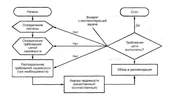 Рисунок 1 - Общая процедура анализа надежности Общая процедура анализа надежности представлена на рисунке 1 и состоит из следующих задач в порядке их применения: a) Определение системы Определение исследуемой системы, режимов и условий ее работы, функциональных связей, включая интерфейсы или процессы. Обычно результаты определения системы являются входом в процесс разработки системы. b) Определение требований/целей надежности Определение всех требований или целей надежности и работоспособности системы, а также характеристик и особенностей системы, режимов ее эксплуатации, условий окружающей среды и требований обслуживания. Определение отказа системы, критериев отказов и условий, основанных на функциональной спецификации системы, ожидаемой продолжительности и условий эксплуатации (циклограмма и время выполнения задания). При определении требований и целей надежности следует руководствоваться [1]. c) Распределение требований надежности Распределение требований или целей надежности системы по различным подсистемам на ранней стадии проекта (при необходимости). d) Анализ надежности Анализ системы на основе методов надежности и соответствующих данных эффективности. 1) Качественный анализ: - анализ функциональной структуры системы; - определение режимов неисправностей системы и компонентов, механизмов отказов, причин и последствий отказов; - определение механизма деградации, который может привести к отказу; - анализ путей отказа/неисправности; - анализ ремонтопригодности с учетом времени, метода изоляции и метода восстановления; - определение адекватности методов диагностики неисправностей; - анализ возможностей предотвращения неисправностей; - определение стратегий технического обслуживания и ремонта. 2) Количественный анализ: - разработка моделей надежности и/или эксплуатационной готовности; - определение необходимых числовых данных; - определение числовых оценок показателей надежности; - проведение необходимого анализа критичности и чувствительности. e) Исследования и рекомендации Анализ выполнения целей требований надежности для рассматриваемого проекта и возможности их выполнения при использовании альтернативных проектов. Действия в этом направлении могут включать решение следующих задач: - оценка улучшения надежности системы по результатам проектирования и производства (например, резервирование, снижение нагрузок, совершенствование стратегий технического обслуживания системы, контроля продукции и технологических процессов, системы менеджмента качества и материально-технической базы производства); Примечание: Показатели надежности могут быть улучшены только в соответствии с проектом. Во многих случаях для повышения надежности необходимо усовершенствовать производственные процессы; - исследование проекта системы и определение слабых мест и режимов критичности отказов компонентов; - исследование проблем интерфейса системы, свойств и механизмов отказоустойчивости и т.д.; - разработка альтернативных путей повышения надежности, например использование резервирования, контроля эффективности, обнаружения неисправностей, методов реконфигурации системы, процедур технического обслуживания, заменяемых компонентов, процедур восстановления; - выполнение исследований по оценке стоимости и сложно