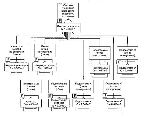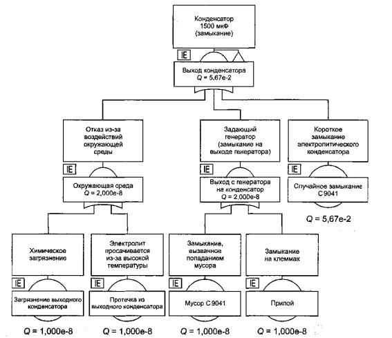 Рисунок А.3 - Подсистема дерева неисправностей (см. рисунок А.2) При изображении дерева неисправностей используют символы, приведенные в таблице А.1. Цель данного анализа - найти наиболее вероятную причину отказа усилителя. В процессе анализа выяснилось, что самый высокий вклад в отказ усилителя вносит электролитический конденсатор, расположенный на выходе усилителя на динамик. Существует высокая вероятность короткого замыкания этого конденсатора. Это является следствием выбора конденсатора с более низким напряжением из-за его меньших габаритов. В результате понижение емкости этого конденсатора составило 90 %. Короткое замыкание является только дополнительной причиной отказа конденсатора. Обе причины привели к увеличению количества отказов конденсатора. Исходная интенсивность отказов электролитического конденсатора (1500 мкФ) не является низкой. Конденсатор был заменен на конденсатор с соответствующим напряжением, что уменьшило вероятность отказа усилителя за срок службы больше чем на 20 %. В результате этого повысилась надежность системы. В этом случае показатель неработоспособности системы Q, рассчитанный для заданного времени эксплуатации, представляет собой вероятность отказа системы F(t), так как ремонт не допускался. В этом примере использовались стандартные клапаны, кроме клапанов подсистем, у которых треугольник указывает, что клапаны будут разработаны позже, а квадрат вокруг них указывает, что каждый из них показан на отдельной странице. Таблица А.1 Символы, используемые при изображении дерева неисправностей