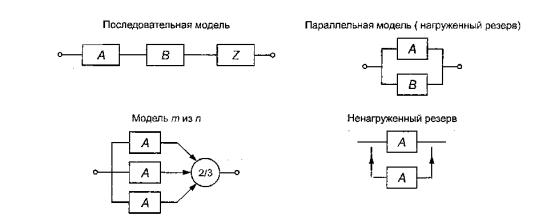 А - без материального ущерба или травмы; В - материальный ущерб, без травмы; С - повреждение автомобиля без другого материального ущерба. Рисунок А.4 - Дерево событий А.1.4 Анализ структурной схемы надежностиА.1.4.1 Описание и цель Метод анализа структурной схемы надежности (RBD) является методом анализа надежности системы. RBD является графическим изображением представления логической схемы системы через подсистемы и/или компоненты и позволяет изобразить пути успеха работоспособности системы в виде логических связей подсистем и компонентов. А.1.4.2 Применение Метод анализа RBD применяют на стадии определения продукции. Структурная схема надежности системы должна быть создана в начале разработки концепции. Разработка RBD должна начинаться сразу после завершения определения программы, как часть анализа требований, и непрерывно расширяться до более глубокого уровня детализации по мере увеличения данных для принятия решений. А.1.4.3 Ключевые элементы Для разработки RBD могут быть использованы следующие методы анализа: - определение исправного состояния системы; разделение системы на функциональные блоки в соответствии с целями анализа надежности. Некоторые блоки могут представлять собой подсистемы, для которых могут быть разработаны свои RBD; - проведение качественных исследований. Количественные оценки по RBD проводят различными методами. В зависимости от типа структуры системы (с восстановлением или без восстановления) могут быть использованы простые Булевы методы, таблицы истинности и/или анализ путей и вырезок для прогнозирования показателей надежности и работоспособности системы, рассчитываемых на основе данных компонентов. А.1.4.4 Достоинства: - структурную схему надежности часто создают непосредственно по функциональной диаграмме системы. Это позволяет сократить количество конструктивных ошибок и/или систематическое описание функциональных путей системы; - пригоден для многих типов конфигурации системы, включая параллельные, избыточные, резервные и альтернативные функциональные пути; - пригоден для полного анализа вариантов при изменении параметров эффективности системы; - позволяет получить простые логические модели путей функционирования и отказа системы (например, используя Булеву алгебру); - пригоден для анализа вклада элементов в надежность системы; - позволяет строить модели оценки вероятностных характеристик надежности и работоспособности системы; - дает компактные результаты вероятностных характеристик для системы в целом. А.1.4.5 Ограничения: - не обеспечивает полный анализ неисправностей, то есть пути причина - следствие или следствие причина не определяются; - требует наличия вероятностной модели эффективности для каждого элемента диаграммы; - не позволяет различать преднамеренные и непреднамеренные результаты, если аналитик - не предусматривает для того специальных действий; - направлен, прежде всего, на анализ работоспособности системы и не распространяется на сложные стратегии ремонта, технического обслуживания или общий анализ работоспособности; - имеет те же ограничения, что и у методов, применяемых для анализа невосстанавливаемых систем. А.1.4.6 Стандарты Применяют ГОСТ Р 51901.14. А.1.4.7 Пример Простые RBD независимых блоков изображены на рисунке А.5.