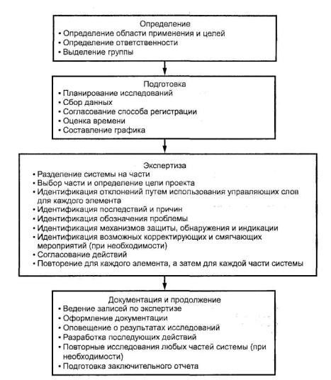 Рисунок А.10 - Этапы исследования HAZOP А.1.8.4 Достоинства: - при исследовании используются навыки и знания группы экспертов, каждый из которых должен знать определенный аспект исследуемой системы; - метод эффективен для обнаружения, как причин, так и последствий отклонений на различных уровнях системы; - метод применяют для анализа технологических процессов; - результаты исследования имеют большое значение при определении необходимых корректирующих мероприятий. А.1.8.5 Ограничения Хотя исследования HAZOP чрезвычайно полезны в различных отраслях промышленности, они имеют ограничения, которые необходимо учитывать при рассмотрении вопроса о применении метода HAZOP: HAZOP рассматривает каждую часть системы и исследует воздействие отклонений на каждую часть. Иногда взаимодействие между частями системы является опасным. В этих случаях опасность должна исследоваться более подробно с применением таких методов, как метод дерева событий и анализ дерева неисправностей; - при использовании любой другой методики идентификации опасностей или проблем работоспособности не может быть гарантии того, что все опасности или проблемы работоспособности идентифицированы. Поэтому исследование сложной системы не должно быть ограничено только исследованием HAZOP. Этот метод используют вместе с другими подходящими методами (например, анализом дерева неисправностей); - существуют системы, тесно связанные между собой, в которых причины неисправности одной системы могут находиться в другой системе. Локальное совершенствование в этом случае не может устранить реальную причину, и неисправность по-прежнему может возникать; - успех исследования в большой степени зависит от способностей и опыта лидера исследования и взаимодействия между членами группы; - метод HAZOP предназначен для исследования только частей системы, их элементов и характеристик, указанных в описании проекта. Действия и операции, которых нет в описании проекта, не рассматривают. А.1.8.6 Стандарты Применяют ГОСТ Р 51901.11. А.1.9 Анализ надежности человеческого фактора А.1.9.1 Описание и цель Анализ надежности человеческого фактора (HRA) является частью анализа человеческого фактора, который включает распределение функций, задач и ресурсов среди людей и машин и оценку надежности действий человека. Анализ человеческого фактора не является самостоятельной дисциплиной. В этом методе используются такие дисциплины как психология, физиология, социология, медицина и проектирование. Специфическая цель анализа человеческого фактора состоит в том, чтобы оценить факторы, которые могут воздействовать на надежность действий человека при эксплуатации системы (анализ надежности человеческого фактора). Надежность человека необходима для успешной работы системы «человек - машина» в условиях воздействия различных факторов. Эти факторы могут быть внутренними (напряжение, эмоциональное состояние, обучение, побуждения и опыт) или внешними (часы работы, среда, действия диспетчеров, процессов, аппаратных средств). А.1.9.2 Применение Влияние человеческого фактора должно быть определено на всех стадиях разработки системы от проекта до обучения, эксплуатации и демонтажа. Метод применим для рассмотрения системы в целом (включая управление при эксплуатации) и взаимодействия отдельных работников при эксплуатации сист