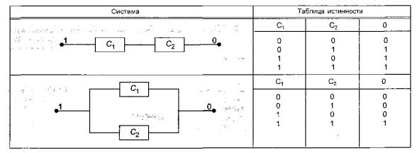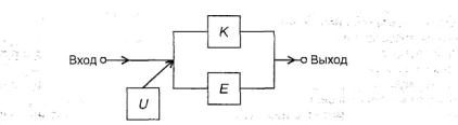 Рисунок А. 13 -Таблица истинности для двух простых систем Вероятность неработоспособного состояния системы рассчитывают на основе вычисления вероятности появления каждого вектора неработоспособного состояния системы. Это возможно, когда компоненты независимы. На рисунке А.13 представлена таблица истинности для двух простых систем. Метод ТТМ позволяет определить все возможные комбинации работоспособных и неработоспособных состояний компонентов. Таким образом, он является наиболее строгим теоретическим методом. Для получения необходимых комбинаций таблицу истинности можно сократить Булевым методом, но его может быть трудно применить к сложной системе, так как число состояний может быстро стать очень большим. А.1.11.3 Стандарты Применяют ГОСТ Р 51901.14. А.1.11.4 Пример Система, представленная на рисунке А.14, состоит из главного пути сигнала К и альтернативного пути сигнала Е. Альтернативный путь не действует при функциональном резервировании. Выключатель U не находится на пути сигнала. Необходимо определить коэффициент готовности системы.