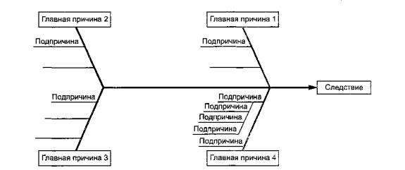 Рисунок А.15 - Диаграмма причин и следствий Основные этапы построения диаграммы: 1) определение воздействий; 2) идентификация главных причин; 3) идентификация вторичных причин; 4) идентификация наиболее вероятных вторичных причин. Примечание: Для второго этапа часто используют метод 4 М: человек, машины, методы, материалы. Могут также использоваться другие главные причины, например, шаги процесса. А.2.8.2 Применение Диаграмму используют при исследованиях на стадии проектирования и анализа последствий отказов, обнаруженных при эксплуатации. А.2.8.3 Ключевые элементы: - следствия должны быть понятны; - установленные причины должны соответствовать следствиям; - соответствующий выбор вторичных причин помогает сбалансировать структуру дерева (скелета); - поскольку реальные причины должны опираться на данные и факты, эта информация должна быть доступной; - компоненты системы, которые становятся слишком сложными или остаются слишком простыми, должны иметь указание на то, что структура должна быть улучшена. А.2.8.4 Достоинства: - помогает работе специалистов в различных областях знаний; - обеспечивает визуальное отображение причин и их структуры - результаты могут использоваться как входные данные для FMEA или анализа неисправностей. А.2.8.5 Ограничения: - отсутствуют количественные исследования; - правильный выбор главных и вторичных причин зависит от опыта группы; - метод не распространяется на многократные последствия. А.2.9 Анализ отчета об отказах и система корректирующих действий А.2.9.1 Описание и цель Анализ отчета об отказах и система корректирующих действий (FRACAS) представляют собой систему закрытого цикла для идентификации, оценки и своевременного устранения последствий отказа. Отказы, появляющиеся в процессе испытаний и оценки, документируются. Данные собираются на нескольких уровнях. Используется система для прослеживания, анализа, последующей идентификации проблем части, ошибок в проекте, недостаточной квалификации персонала и неточностей процесса, требующих корректирующих действий. После определения причин отказа необходимо провести разработку корректирующих действий, эффективность которых проверяют до их выполнения. А.2.9.2 Применение FRACAS проводят сразу же, как только появляется возможность работы с аппаратными средствами и программным обеспечением. Весь персонал, участвующий в испытаниях и оценке, несет ответственность за документирование отказов. Отказы проверяют и по возможности локализуют. Группа исследований FRACAS анализирует данные для определения значимости проблем и проблем, требующих корректирующих действий. В группе должны быть специалисты всех дисциплин, связанных с возможными проблемами. Исследования отказов проводят на уровне, необходимом для определения корректирующих действий по устранению проблемы. Проверка эффективности корректирующих действий включает заключение группы о предотвращении повторных отказов. А.2.9.3 Ключевые элементы - форма отчета соответствует исследуемым системе и процессу; - база данных для документирования всех действий, связанных с анализом и решением проблем; - группа специалистов по необходимым дисциплинам; - механизм для прослеживания решения проблем. А.2.9.4 Достоинства: - могут быть использованы данные, собранные для разных условий эксплуатации и окружающей среды; - применя