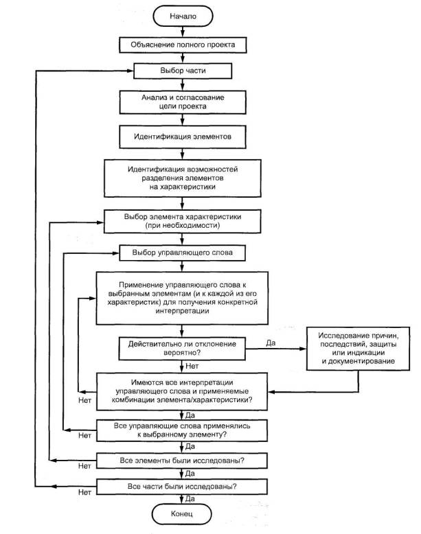 Рисунок 2b - Схема алгоритма процедуры экспертизы НА20Р «сначала управляющее слово» c) Интерпретация управляющего слова, применяемого первым, исследуется применительно к исследуемому элементу или характеристике для выявления вероятного отклонения от целей проекта. Если вероятное отклонение идентифицировано, исследуются возможные причины и последствия. В некоторых случаях указывают категории отклонения по тяжести последствий или по относительному риску, основанному на использовании матрицы рисков. Использование матриц рисков - по ГОСТ Р 51901.1. d) Группа проводит идентификацию наличия механизмов защиты, обнаружения и индикации отклонений, которые могут входить в выбранную часть или обеспечивать выполнение целей проекта другими частями. Такие механизмы защиты не должны быть предназначены для устранения исследуемой потенциальной опасности или проблемы работоспособности, или попытки уменьшения вероятности их появления или смягчения последствий. e) Лидер исследования суммирует результаты, которые затем документирует регистратор. При необходимости дополнительной работы специалиста его необходимо зарегистрировать, как ответственного за выполнение этой работы. f) Процесс повторяют сначала для всех других интерпретаций этих управляющих слов, затем для других управляющих слов, затем для каждой характеристики исследуемого элемента (если анализ на уровне характеристики был согласован для этого элемента), затем для каждого исследуемого элемента части, после того как часть исследована. Процесс повторяют до тех пор, пока не будут исследованы все части. Альтернативный метод применения управляющих слов состоит в том, чтобы первое управляющее слово можно было применить к каждому из элементов части. После этого результаты исследования со следующим управляющим словом применяют ко всем элементам. Процесс повторяют до тех пор, пока все управляющие слова не будут применены ко всем элементам части (рисунок 2b). Выбор последовательности и действий должны проводить лидер исследования и группа HAZOP. На этот выбор влияет способ проведения экспертизы HAZOP. Другими факторами, влияющими на выбор, являются характер использованных методов, потребность в гибкости проведения экспертизы и квалификация членов группы. 6.6 Документация6.6.1 Общие положения Основным достоинством исследования HAZOP является то, что он представляет собой систематический, упорядоченный и документированный подход. Лидер исследования отвечает за оформление соответствующих отчетов по каждому заседанию. Регистратор должен обладать хорошими техническими знаниями в области исследуемой темы, лингвистическими навыками и хорошими способностями выслушивать и обращать внимание на детали. В приложении А указаны различные методы регистрации. 6.6.2 Виды регистрации Существует два основных вида регистрации HAZOP: полный и частичный. Вид регистрации и регистратор должны быть определены до начала заседания. Полная регистрация заключается в записи всех результатов применения каждого управляющего слова (комбинации элемент/характеристика) к каждой части или элементу в описании проекта. Этот способ регистрации используют в случае, если необходимо, чтобы исследование было полным и удовлетворяло наиболее строгим требованиям аудита. Частичная регистрация заключается в записи т