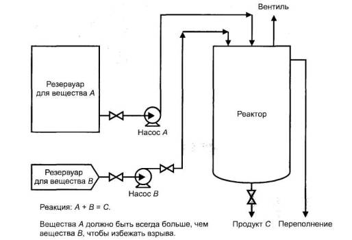 Вещество: А. Действие: непрерывное перемещение вещества А с большей скоростью, чем скорость перемещения вещества В. Источник: резервуар для вещества А. Адресат: Реактор |