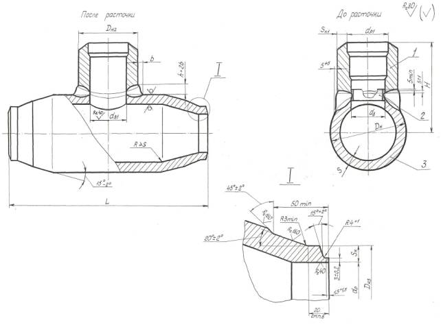 Указанием Министерства энергетического машиностроения от 04.06.82 № ВВ-002/4628 срок введения с 01.01.85 до 01.01.96 (Измененная редакция. Изм. № 1) (Измененная редакция. Изм. № 3) (Измененная редакция. Изм. № 4) Проверен в 1983 г. (Отметка введена дополнительно. Изм. № 1) 1. Настоящий стандарт распространяется на тройники сварные переходные паропроводов тепловых электростанций с абсолютным давлением Р=25,01 МПа (255 кгс/см2) и температурой пара t=545ºC. (Измененная редакция. Изм. № 3) 2. Конструкция и размеры сварных тройников должны соответствовать указанным на чертеже и в табл. 1 и 2. 3. Сварочные материалы - по ОСТ 108.940.02-82. 4. После сварки штуцер поз. 1 растачивается напроход до диаметра dв1 с целью удаления подкладного кольца и корня шва (см. чертеж). 5. Материал трубы поз. 3 – сталь 15ХIМIФ по ТУ 14-3-460-75. 6. Размер прямого участка - рекомендуемый и уточняется технологическим процессом изготовителя. Допускается изготовление подкатанной части без прямых участков. 7. Остальные технические требования по ОСТ 24.125.60-89. (Измененная редакция. Изм. № 3) (Измененная редакция. Изм. № 4) 8. Масса наплавленного металла уточняется технологическим процессом. Пункт 8. (Введен дополнительно. Изм. № 2)
