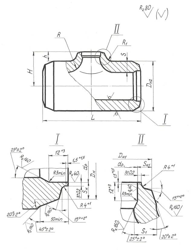 Указанием Министерства энергетического машиностроения от 04.06.82 № ВВ-002/4628 срок введения с 01.01.85 до 01.01.96 (Измененная редакция. Изм. № 1) (Измененная редакция. Изм. № 3) (Измененная редакция. Изм. № 4) Проверен в 1983 г. (Отметка введена дополнительно. Изм. № 1) 1. Настоящий стандарт распространяется на переходные штампованные тройники с вытянутой горловиной для паропроводов тепловых электростанций с абсолютным давлением и температурой пара: Р=13,73 МПа (140 кгс/см2), t=560ºC; Р=13,73 МПа (140 кгс/см2), t=545ºC; Р=13,73 МПа (140 кгс/см2), t=515ºC; Р=4,02 МПа (41 кгс/см2), t=545ºC. (Измененная редакция. Изм. № 3) 2. Конструкция, размеры и материал тройников должны соответствовать указанным на чертеже и в таблице. 3. Размеры высот Н и h радиусов R и R1 и толщины стенки Sk1 - могут быть изменены при соблюдении условий прочности по усмотрению изготовителя. 4. Предельные отклонения по наружному диаметру Dн2 не должны превышать плюс 1,25% и минус 2%. 5. Остальные технические требования по ОСТ 24.125.60-89. (Измененная редакция. Изм. № 3) (Измененная редакция. Изм. № 4) 6. Исполнения, указанные в скобках, применять по согласованию с предприятием-изготовителем. Пункт 6. (Введен дополнительно. Изм. № 2) 7. Размер S1 обеспечивается технологией изготовления. Пункт 7. (Введен дополнительно. Изм. № 4)