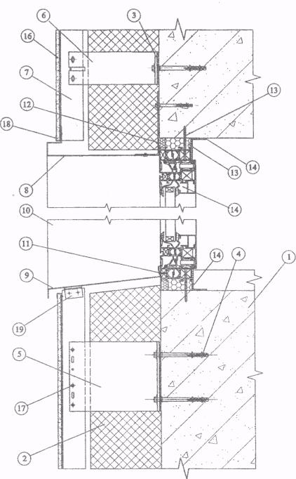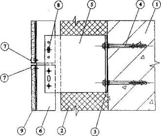 1. Основание 2. Минераловатный утеплитель 3. Паронитовая прокладка 4. Анкерный дюбель 5. Кронштейн несущий 6. Вертикальный профиль 7. Кляммер крайний 8. Заклепка односторонняя алюминиевая 9. Плита облицовочная Рис. 3.9. Вертикальный разрез деформационного блока (термошва)