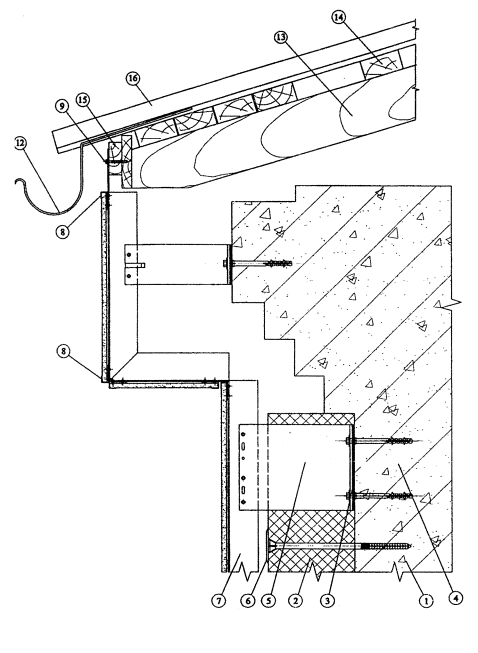 Рис. 3.17. Вертикальный разрез примыкания системы к карнизу 4. исходные данные для проектирования системы4.1. Проектно-сметная документация на систему для конкретного объекта разрабатывается на основе задания на проектирование, подготавливаемого в соответствии с существующим в г. Москве порядком и утверждаемого заказчиком. Задание на проектирование обязательно должно содержать требование о соответствии системы СНиП 23-02-2003 и МГСН 2.01-99. 4.2. Задание на проектирование должно включать: - архитектурные чертежи фасадов здания, в т.ч. сведения о фактуре и цвете облицовочных материалов, чертежи архитектурных деталей (карнизов, обрамления проемов и т.п.) и другие необходимые данные, если это не входит в состав работ по конкретному заданию; - строительные чертежи наружных стен от фундаментов до парапетов, включая узлы, поясняющие решение и размеры конструкций; - данные от разработчиков конструкций фундаментов о величине допустимой дополнительной нагрузки на стены здания или заключение компетентной организации о несущей способности фундаментов здания; - план участка, где расположено здание. Для реконструируемых зданий задание на проектирование дополнительно должно содержать акт обследования наружных стен здания, где указывается состояние поверхности фасадов, результаты испытаний принятых дюбелей на выдергивание из стены и геодезическую съемку поверхностей фасадов с данными о величине отклонений их отдельных участков от вертикальной плоскости. 4.3. В состав задания на проектирование должна быть включена Техническая оценка Госстроя России ФЦС ТВ-1118-05 (приложение к Техническому свидетельству) на данную фасадную систему. 5. Определение основных параметров системы5.1. Основными параметрами системы являются: - схема размещения на фасаде здания кронштейнов и вертикальных профилей со всеми необходимыми размерами, в том числе расстояние от основания до экрана; - марка дюбелей для крепления кронштейнов несущего каркаса к основанию; - характеристика принятых плит утеплителя: марка, размеры, плотность, теплопроводность, наличие или отсутствие защитной пленки; - величина воздушного зазора; - марка дюбелей для крепления плит утеплителя к основанию; - тип и размер облицовочных материалов и способ их крепления к несущему каркасу; 5.2. Схема размещения на фасаде здания элементов несущего каркаса разрабатывается, исходя из следующих условий: - размеров по ширине облицовочных плит, вертикальный шов между которыми должен располагаться в центре вертикального профиля; - геометрии фасада здания, расположения проемов, балконов, карнизов и других западающих (выступающих) от плоскости фасада элементов для сокращения количества облицовочных плит с нестандартными размерами; - результатов прочностных расчетов системы, на основании которых уточняется шаг установки кронштейнов по горизонтали и вертикали; - расстояния от основания до экрана, принятого на основании теплотехнических расчетов, при этом следует учитывать величину фактических отклонений фасада от проектного положения. 5.3. Марку дюбелей для крепления кронштейнов и утеплителя выбирают с учетом результатов прочностных расчетов системы, материала основания, паспортных данных принятых дюбелей и результатов их испытаний на выдергивание из стены. 5.4. Выбор плит утеплителя выполняется на основ