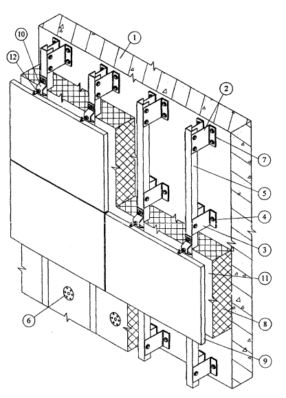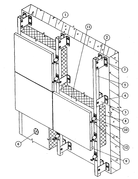 В зависимости от выбранного варианта крепления плит (рис. 3.1-3.2) шпильки Z-образных элементов могут располагаться либо в боковых (вертикальных) гранях, либо в верхней и нижней (горизонтальных) гранях облицовочных плит. В качестве варианта для облицовки участков, примыкающих к оконным проемам, применяются плоские элементы SS-02 (рис. 3.7). 3.3.4. Несущие элементы системы изготавливает фирма «URUN Ins» (Турция). Все элементы каркаса выполнены из нержавеющей стали А2 (А 304) по DIN 5091. 3.4. В системе «Стоун-Строй» применяют негорючий минераловатный утеплитель различной плотностью, в том числе VENTIBATTS, PAROC, NOBASIL и др. Толщина слоя утеплителя определяется теплотехническим расчетом, методика которого приводится в разделе 7 настоящих рекомендаций. Основные типоразмеры минераловатных плит 600×1000 и 600×1200 мм. Плиты утеплителя крепят непосредственно к основанию тарельчатыми дюбелями со стальными или стеклопластиковьши распорными элементами не менее 8 штук на 1 м2. 3.4.1. В случае применения плит утешштеля без кашированной внешней поверхности их следует покрывать влаговетрозашитной паропроницаемой пленкой типа «TYVEK». 3.5. В системе «Стоун-Строй» для устройства экрана применяют облицовочные плиты из натурального камня: гранита, габбро или другого природного камня. Максимальные размеры плит составляют 1200×650 мм при толщине 25-50 мм. Для крепления облицовочных плит используют шпильки из нержавеющей стали А2 (А 304), на которые надевается втулка из полиамида, и которая, в свою очередь, помещается в заранее просверленное отверстие в торце плиты. В отверстие перед установкой плит нагнетается бесцветный герметик (см. рис. 3.8). 3.6. Изделия и материалы, разрешенные для применения в системе «Стоун-Строй», и требования, которым они должны отвечать, приводятся в «Технической оценке» - приложениям к Техническим свидетельствам Госстроя РФ на данную систему. 3.7. Конструктивное решение системы «Стоун-Строй» поясняется следующими рисунками: - общий вид фасада, защищенного утеплителем, приведен на рис. 3.1-3.2; - узлы крепления утеплителя и облицовочных плит на внутреннем и наружном углах здания - на рис. 3.8, 3.9, 3.10; - примыкание к оконному проему - на рис. 3.11-3.13; - узел примыкания к парапету на рис. 3.14; - узлы примыкания к цоколю на рис. 3.15-3.17. 1. Существующая стена. 2. Несущий кронштейн. 3. Кронштейн. 4. Анкерный дюбель. 5. П-образный вертикальный профиль. 6. Тарельчатый дюбель для крепления утеплителя. 7. Парояитовая прокладка 8. Минераловатный утеплитель. 9. Плиты облицовочные. 10. Z-образньш элемент. 11. Воздушная прослойка. 12. Регулируемая ручка Рис.3.1. Фасадная система "Стоун-Строй" с облицовкой плитами из природного камня (горизонтальное крепление). 1. Существующая стена. 2. Несущий кронштейн. 3. Кронштейн. 4. Анкерный дюбель. 5. П-образный вертикальный профиль. 6. Тарельчатый дюбель для крепления утеплителя. 7. Паронитовая прокладка 8. Минераловатный утеплитель 9. Плиты облицовочные. 10. Z-образный элемент. 11. Воздушная прослойка. 12. Регулируемая ручка. Рис. 3.2. Фасадная система "Стоун-Строй" с облицовкой плитами из природного камня (вертикальное крепление).