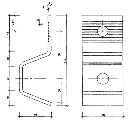 кронштейна под болтом Крепление к стене Вырывающее усилие на болт в угловых зонах равно: Nв = 1435 Н. Под это усилие следует подбирать конструкцию дюбелей и болтов с учетом материала основания по каталогам фирм-изготовителей, в частности, швейцарской фирмы «Mungo». 6.4.7. Расчет Z-образного элементаГеометрические характеристики поперечного сечения полного: b=50 мм; d=6 мм; А=300 мм2; Wx=300 мм3; ослабленного регулирующей ручкой bn = 37 мм; d=6 мм; Аn=222 мм3; Wxn=222 мм3; то же болтом bn = 37 мм; d=5 мм; Аn=185 мм3; Jxn=385 мм3; Sxn=116 мм3; t=d=5 мм. Усилия От вертикальной расчетной нагрузки Изгибающие моменты: