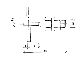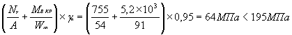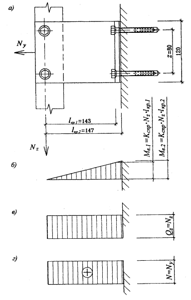 Прочность кронштейна на растяжение с изгибом и сдвиг обеспечивается. 6.4.6. Расчет крепления кронштейна к стенеКрепление производится четырьмя стальными болтами Ø 12 мм с расчетным диаметром dо=9,7 мм и расчетной площадью сечения 1 болта An = 74 мм2. Плечо (вылет) до стены Плечо внутренней пары сил в плоскости стены Z = 80 мм. Растягивающее усилие в болте: от продольной силы Nδ1