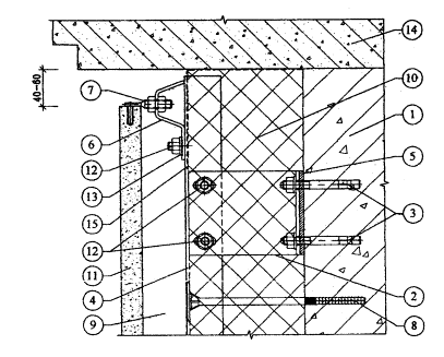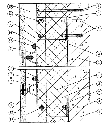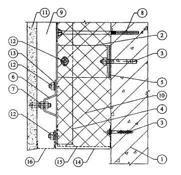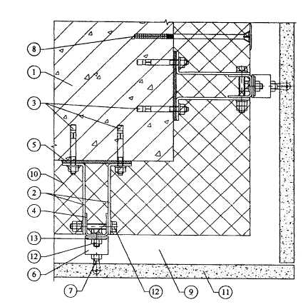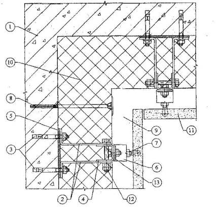 Рис. 3.7. Анкер SS 02 (типы А и Б). 1. Существующая стена. 2. Несущий кронштейн. 3. Кронштейн. 4. Анкерный дюбель. 5. П-образный вертикальный профиль 6. Паронитовая прокладка. 7. Z-образный элемент. 8 Регулируемая ручка 9. Тарельчатый дюбель для крепления утеплителя. 10. Воздушная прослойка. 11. Минераловатный утеплитель. 12. Плиты облицовочные. 13. Болт и гайка М12. 14. Шайба. Рис. 3.8. Вертикальный разрез системы "Стоун-Строй". 1. Существующая стена. 2. Кронштейн. 3. Анкерный дюбель. 4. П-образный вертикальный профиль 5. Паронитовая прокладка. 6. Z-образный элемент. 7. Регулируемая ручка. 8. Тарельчатый дюбель для крепления утеплителя. 9. Воздушная прослойка. 10. Минераловатный утеплитель. 11. Плиты облицовочные. 12. Болт и гайка M12. 13. Шайба. Рис. 3.9. Горизонтальный разрез системы по наружному углу.