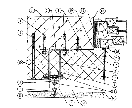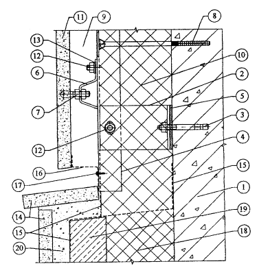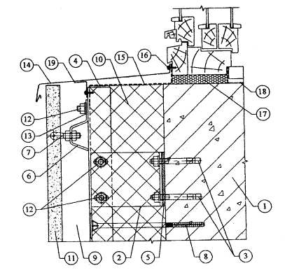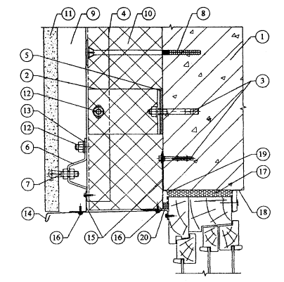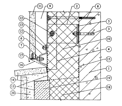 1. Существующая стена. 2. Кронштейн. 3. Анкерный дюбель. 4. П-образный вертикальный профили. 5. Паронитовая прокладка. 6. Z-образный элемент 7. Регулируемая ручка 8. Тарельчатый дюбель для крепления утеплителя. 9. Воздушная прослойка. 10. Минераловатаый утеплитель. 11. Плиты облицовочные. 12. Болт и гайка М12. 13. Шайба. Рис. 3.10. Горизонтальный разрез системы по внутреннему углу. 1. Существующая стена. 2. Кронштейн. 3. Анкерный дюбель. 4. П-образный вертикальный профиль. 5. Паронитовая прокладка. 6. Z-образный элемент. 7. Регулируемая ручка 8. Тарельчатый дюбель для крепления утеплителя. 9. Воздушная прослойка. 10. Минераяоватный утеплитель. 11. Плиты облицовочные. 12. Болт и гайка М12. 13. Шайба. 14. Слив. 15. Кронштейн для откоса. 16. Саморез. 17. Пенный утеплитель. 18. Пароизоляционная лента 19. Водоизоляционная паропроницаемая лента. 20. Изоляционная саморасширяющаяся паропроницаемая лента. Рис. 3.11. Вертикальный разрез системы по верху оконного проема.