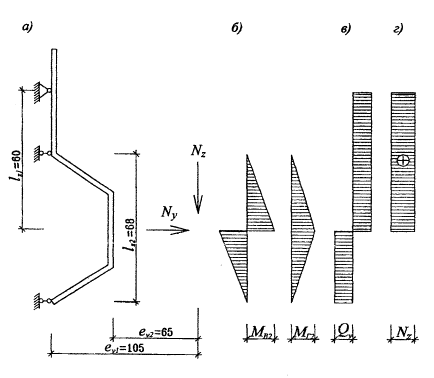 нормативная Рис. 6.1. Расчетная схема облицовочной плиты а - размеры и опирание плиты; б - расчетная схема на ветровую нагрузку Рис. 6.2. Расчетные схемы вертикальной направляющей а - на вертикальные нагрузки; б - на горизонтальные нагрузки. Рис. 6.3. Расчетная схема несущего кронштейна: а - схема приложения усилий; б, в, г - эпюры М, Q и N. Рис. 6.4. Расчетная схема Z-обрачяого элемента: а - условия опирания и усилия; б, в, г - эпюры М, Q и N. Ветровые нагрузки приняты для высоты Н = 75 м: нормативное значение ветрового давления для I ветрового района wo = 0,23 кПа; коэффициент «К» для зданий высотой 75 м, тип местности «В», по табл. 6 [4] К = 1,42; аэродинамический коэффициент принимается для угловых зон фасада при отрицательном давлении ветра Се = | -2 |; для средних зон при положительном давлении ветра Сс = 0,8; коэффициенты, учитывающие пульсационную составляющую ветровой нагрузки: для угловых зон γр = 1,3; для средних зон, вычисленный по формуле (8) [4] γр = 1,5; коэффициент γm = 1,2 увеличения средней величины ветрового давления при расчете узлов крепления γр и γm - по рекомендации ЦНИИСК, как дополнение к [4] ). Горизонтальные ветровые нагрузки (Па): в угловых зонах: нормативная в средних зонах: Для дальнейших расчетов принимаются ветровые нагрузки только в угловых зонах; индексы «е» и «с» далее опускаются. 6.4.3. Расчет облицовочной плитыГеометрические характеристики Для плиты шириной вz=0,6 м; d=30 мм; в=600 мм; Wz=9·104 мм3; Jz=45·104 мм4; Sy=67500 мм3; lx=0,6 м; lx,k=0,3 м. Усилия Вертикальные и горизонтальные нагрузки на облицовочные плиты - по п. 6.4.2. Так как проверка прочности плит в их плоскости не требуется, то используются лишь горизонтальные ветровые нагрузки. Для шарнирно опертой
