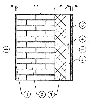 1 - штукатурный раствор; 2 - кирпичная кладка; 3 - минеральная вата; 4 - панель экрана; 5 - воздушная прослойка; 6 - зона возможной конденсации. Рис. 7.1. Схема наружной стены для расчета влажностного режима. Сопротивление теплопередаче но глади наружной стены при толщине утеплителя из минваты 0,15 м: