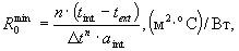 aint - коэффициент теплоотдачи внутренней поверхности ограждающей конструкции, Вт/(м2·°С), принимаемый по таблице 7 СНиП 23-02. 2. Требованиям энергосбережения, согласно которым приведенное сопротивление теплопередаче должно быть не ниже минимального значения сопротивления теплопередаче, определенного по второму этапу повышения теплозащиты. Нормативные значения приведенного сопротивления теплопередаче приведены в приложении Д ТСН 23-349. 3. Требованиям к минимально-допустимым температурам внутренней поверхности ограждающих конструкций, определяемым, исходя из условия отсутствия выпадения конденсата, а для оконных конструкций - обеспечения минимальной температуры профиля и стеклопакета не ниже +3 °С при расчетных условиях. 4. Требованиям минимально допустимой воздухопроницаемости отдельных конструкций ограждения. В том случае, если фактическое сопротивление теплопередаче наружной стены ниже нормативного не более чем на 5%, допускается её применение при условии увеличения сопротивления теплопередаче перекрытий или покрытия. При этом трансмиссионный приведенный коэффициент теплопередачи должен быть не выше значения, определяемого на основании нормативных требований по энергосбережению. 4.3 Требования по теплозащите здания в целом (потребительский подход)При реализации потребительского подхода за критерий энергетической эффективности следует принимать величину удельного расхода тепловой энергии на отопление проектируемого здания qhreq, кДж/(м2·°С·сут.) [кДж/(м3·°С·сут.)]. Выбор величин приведенного сопротивления теплопередаче отдельных ограждающих конструкций следует принимать равными не ниже значений, определенных по формуле (4.2) для стен жилых и общественных зданий, либо по формуле (4.3) - для остальных ограждающих конструкций.