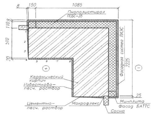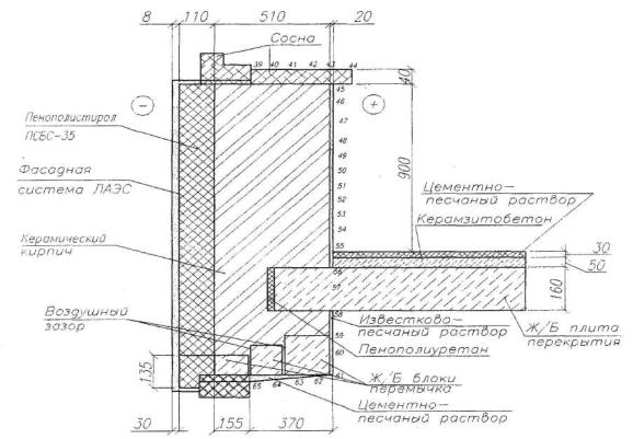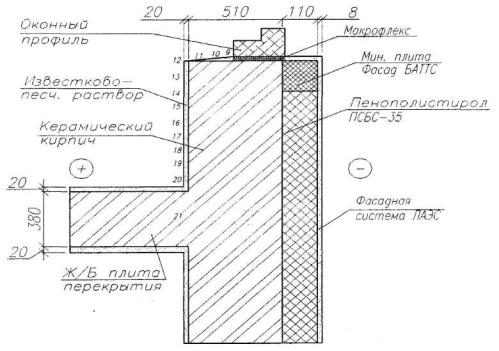 Пенополистирол широко используется в качестве утеплителя в фасадных системах. Так как он является горючим материалом, предусматриваются противопожарные рассечки из минваты шириной не мене 150 мм. Примеры строительных узлов представленные в приложении Е. Сведения об организациях - производителях приведены в приложении Г ТСН 23-349. Исходные данные и теплофизические характеристики для расчета конструкций с использованием пенополистирола приведены в таблице Б.1 приложения Б. Стена из силикатного кирпича, утепленная снаружи