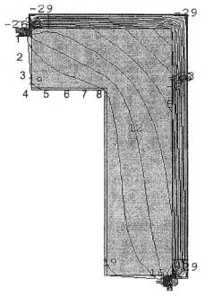 Рис. 4.7. Наружный угол здания (узел I). Значения температур на внутренней поверхности наружной стены, °С: 1 - 13 °С; 2 - 17,1 °С; 3 - 18,5 °С; 4 - 19,5 °С; 5 - 19,1 °С; 6 - 18,6 °С; 7- 17,7 °С; 8 - 15,9 °С.