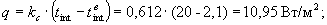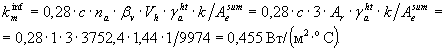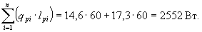 где qpi - линейная плотность теплового потока через поверхность теплоизоляции, приходящаяся на 1 м длины трубопроводов i-гo диаметра, Вт/м; lpi - длина трубопровода i-гo диаметра, принимаемая по проекту, м; VB - объем воздуха, заполняющего пространство подвала, м3; nа - кратность воздухообмена в подвале, ч-1; ρ - плотность воздуха в подвале, принимаемая равной ρ = 1,2 кг/м3;