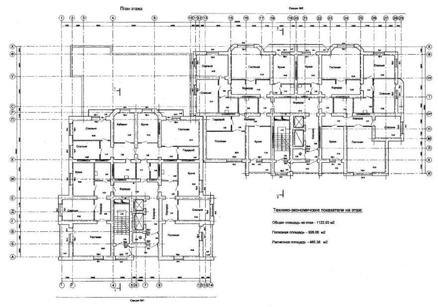где qрасч = aint ·(tint - τmit) - удельный тепловой поток, Вт/м2; aint - коэффициент теплопередачи со стороны внутренней поверхности стены, Вт/(м2·°С); τmit - средняя температура внутренней поверхности стены, °С; tint, text температура внутреннего и наружного воздуха соответственно, °С. Данный метод является наиболее точным. Для расчета двухмерных или трехмерных температурных полей используются различные приближенные методы. В последнее время наибольшее распространение получил метод конечных элементов, реализованный в различных программных комплексах. Наибольшее распространение для моделирования двухмерных задач теплопроводности и диффузии в строительных узлах и оконных конструкциях нашла специализированная программа THERM 5.O. THERM 5.0. - это современная, функционирующая под управлением операционной системы Microsoft Windows, компьютерная программа, разработанная в Лоурене Берилл Лаборатории (LBNL) Калифорнийского университета (США), доработанная и адаптированная ООО «Апрок-тест» (г. Москва). Она рекомендована Госстроем РФ для расчета строительных ограждающих конструкций. 4.4.1 Теплотехнический расчет наружных стенМетодику теплотехнического расчета наружных стен по температурным полям рассмотрим на следующем примере. Выполнить теплотехнический расчет фрагмента наружной стены 2-х секционного 12-ти этажного жилого дома, план которого приведен на рис. 4.1. Наружная стена выполнена из керамического кирпича толщиной 510 мм, утепленная пенополистиролом марки ПСБС-35 с применением фасадной системы. В соответствии с противопожарными требованиями выполнены горизонтальные противопожарные рассечки из минераловатных плит ФАСАД БАТТС шириной 150 мм через промежутки равные высоте этажа, а также все оконные проемы по периметру обрамляются полосами из минераловатных плит. Исходные данные: 1. Район строительства - г. Самара. 2. Температура наиболее холодной пятидневки, text = -28°C. 3. Средняя
