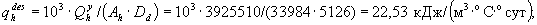 где Gven - приведенный расход воздуха в системе вентиляции, определяемый по табл. 6 СП 23-101; Gven = 25,2 кг/(м2·ч) - для 12-ти этажного дома с газовыми плитами; qp - удельные тепловыделения от трубопроводов, расположенных на теплом чердаке, в расчете на 1 м2 площади чердака, Вт/м2. В рассматриваемом примере принята нижняя разводка. Поэтому, qp = 0.