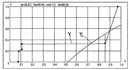 Рис. Б4. Влажностный режим ограждения. На рис. Б4 представлена зависимость безразмерного сопротивления паропроницанию Y от безразмерного термического сопротивления X для рассматриваемой конструкции. Кривая YH характеризует значения безразмерного сопротивления паропроницанию для состояния полного насыщения влажного воздуха водяным паром. Кривая YH построена для значений: температуры внутреннего воздуха tint = 20 °C и относительной влажности φ = 83 %. Параметры наружного воздуха приняты средними для наиболее холодного месяца (t1ext = -12.2 °С ; φ = 83 %).