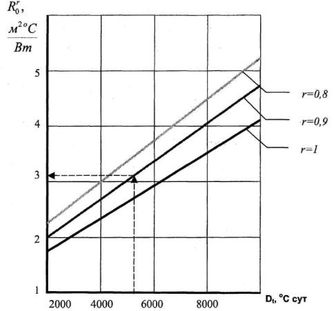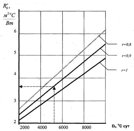 Из приведенных выше данных можно сделать вывод, что наличие тонких пленок, образующихся на поверхности каждого слоя пенополиуретана при его напылении, приводит к существенному снижению коэффициента паропроницаемости. Поэтому при внутреннем утеплении наружных стен, как показали результаты расчетов, не требуется установка дополнительной пароизоляции. По изложенной в разделе 4 методике был выполнен теплофизический расчет строительных ограждающих конструкций в соответствии с техническим заданием, составленным Департаментом по строительству, архитектуре, жилищно-коммунальному и дорожному хозяйству Администрации Самарской области. В данном приложении представлены проектные решения наружных стен и перекрытий с использованием пенополиуретана в качестве утеплителя. Расчет выполнен с использованием программы «Диффузия» разработанной авторами. В табличной форме приведены значения толщин теплоизоляции и пароизоляции, а также сопротивление теплопередаче и паропроницанию при коэффициенте теплотехнической однородности r = 1, т.е. для глади стены. При выполнении теплотехнического расчета необходимо предварительно задать значение коэффициента теплотехнической однородности, руководствуясь рекомендациями, приведенными в СНиП 23-02, а также рекомендациями которые изложены в методических указаниях по расчету теплозащитных показателей ограждающих конструкций (Авдеев Г.К., Василюк B.C., Копылов К.П.). Требуемое сопротивление теплопередаче для глади стены можно определить графическим способом, с помощью рис. Б1 и рис. Б2. На рис. Б1 представлена зависимость требуемого сопротивления теплопередаче глади стены от градусо-суток отопительного периода (ГСОП) для различных значений коэффициентов теплотехнической однородности r для жилых зданий, лечебно-профилактических и детских учреждений, школ и интернатов, на рис. Б2 - для общественных и административных зданий. Далее по величине сопротивления теплопередаче, с помощью таблиц для принятой ограждающей конструкции, определяется требуемая толщина пенополиуретана. Пример теплофизического расчета наружной стены утепленной изнутри пенополиуретаном приведен в данном приложении. Сведения об организациях - производителях приведены в приложении Г ТСН 23-349