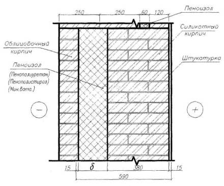 Стена из силикатного кирпича, утепленная изнутри, с защитным слоем из гипсокартона