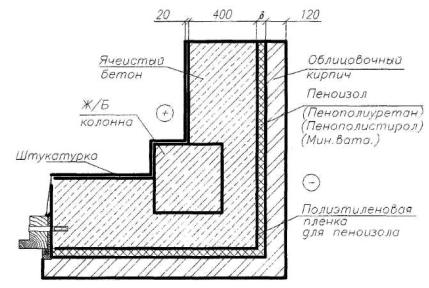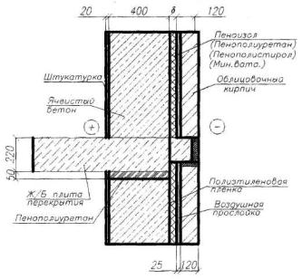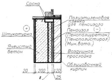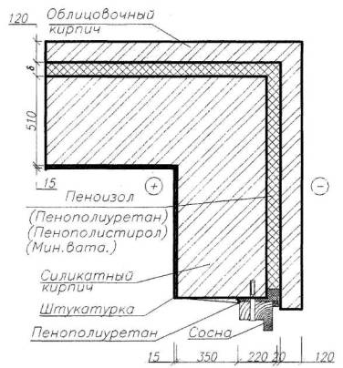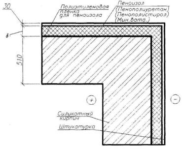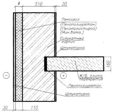 Пеноизол в настоящее время является одним из самых дешевых утеплителей. Он широко применяется в многослойных ограждающих конструкциях - в колодцевой и слоистой кладках из силикатного или керамического кирпича, в самонесущих наружных стенах из ячеистого бетона в качестве теплоизоляционного слоя, а также в сэндвич - панелях. Сведения об организациях - производителях приведены в приложении Г ТСН 23-349 Исходные данные и теплофизические характеристики для расчета конструкций с использованием пеноизола приведены в таблице Б1 приложения Б. Стена из силикатного кирпича, утепленная изнутри, с защитным слоем из известково-песчаного раствора