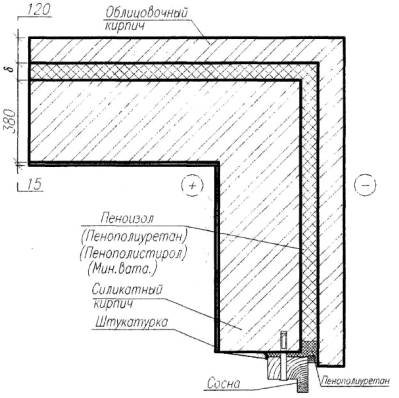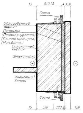 Стена из силикатного и керамического кирпича, утепленная изнутри, с защитным слоем из известково-песчаного раствора