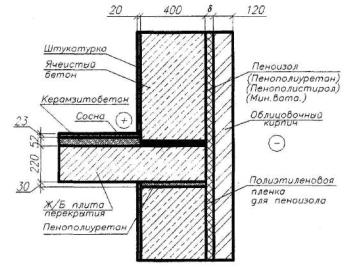 Стена из керамзитобетона, утепленная изнутри, с защитным слоем из известково-песчаного раствора