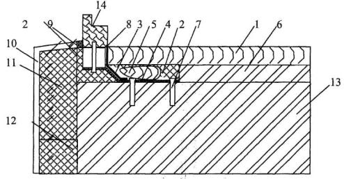 1 - подоконная доска; 2 - макрофлэкс; 3 - пароизоляционная бутилкаучуковая уплотнительная лента; 4 - гибкая анкерная пластина; 5 - опорная колодка; 6 - штукатурный раствор; 7 - дюбель со стопорным шурупом; 8 - рамный дюбель; 9 - уплотнительная саморасширяющаяся лента ПСУЛ; 10 - фасадная система; 11 -минплита; 12 -пенополистирол/пеноизол/пенополиуретан/мин.вата; 13 - керамический кирпич, 14 - профиль. Рис. Е.18. Узел нижнего примыкания оконного блока к проему в стене, с отделкой внутреннего откоса штукатурным раствором.