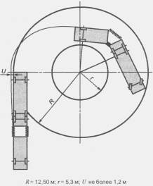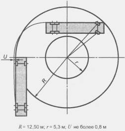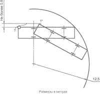 где b - ширина полуприцепа; базу для целей данного пункта измеряют как расстояние от оси седельно-сцепного устройства до центра неуправляемой тележки; если одна или более осей неуправляемой тележки имеет механизм разгрузки оси (см. 2.18), в расчет принимают наибольшее значение базы из вариантов с поднятой/опущенной осью (осями). В случае сомнений можно потребовать проведения испытаний на соответствие 5.6.1. 5.6.2 Дополнительные требования для транспортных средств категории NКогда транспортное средство находится в неподвижном положении с колесами, повернутыми в положение, в котором наиболее выступающая наружу поворота точка в передней части транспортного средства при движении по кругу будет двигаться по окружности радиусом 12,5 м, вертикальная плоскость, касательная к боковой поверхности транспортного средства с внешней стороны поворотного круга, должна быть зафиксирована путем проведения линии на опорной поверхности. Когда транспортное средство движется вперед в любую сторону, описывая окружность в соответствии с предыдущим абзацем, ни одна из его частей не должна выступать наружу поворота за описанную выше вертикальную плоскость более чем на 0,8 м (см. рисунок 2).
