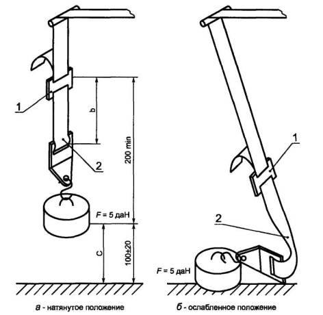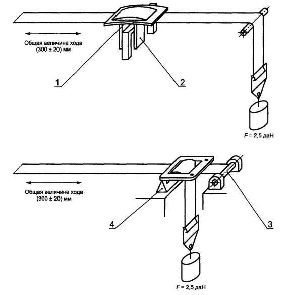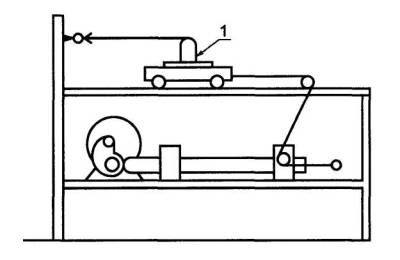 При испытании втягивающих устройств на чувствительность к движению лямки втягивающее устройство монтируется на закрепленной опоре, а лямка крепится к тележке.