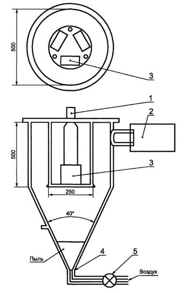 1 - механизм для приведения в возвратно-поступательное движение циклами; 2 - пылеуловитель; 3 - втягивающее устройство; 4 - отверстие; 5 - кран и фильтр