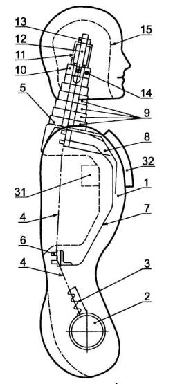 - должно быть расположено в дуге окружности, радиус которой составляет КВ1 = 790 мм, если расстояние между верхней направляющей лямки и местом выхода лямки на втягивающем устройстве составляет не менее 540 мм, либо во всех остальных случаях - на дуге окружности с центром в точке К и радиусом 350 мм.