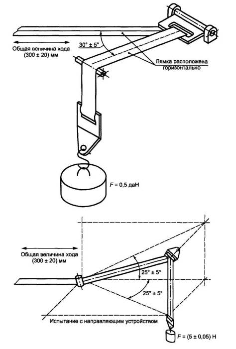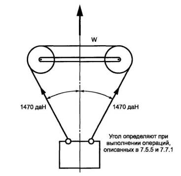 г) Конкретные условия испытаний: Испытание 1: лямка скользит через регулирующее устройство. К одному концу лямки прилагают постоянную вертикальную нагрузку 2,5 даН, другой конец лямки прикрепляют к устройству, обеспечивающему горизонтальное возвратно-поступательное движение лямки. Регулирующее устройство устанавливают на горизонтально расположенной лямке таким образом, чтобы она оставалась в натянутом положении (рисунок М.1). Испытание 2: лямка меняет свое направление при прохождении через жесткий элемент. При этом испытании углы изгиба лямки должны соответствовать указанным на рисунке М.2. Постоянная нагрузка, прилагаемая в ходе испытания, должна составлять 0,5 даН. Если лямка при прохождении через жесткий элемент меняет свое направление более одного раза, то нагрузка в 0,5 даН может быть увеличена настолько, чтобы обеспечить предусмотренный ход лямки в 300 мм через жесткий элемент. Испытание 3: лямка прикреплена к жесткому элементу сшиванием или подобными способами. Общая длина хода возвратно-поступательного движения составляет (300 ± 20) мм, однако нагрузку 5 даН прилагают лишь на участке хода (100 ± 20) мм в течение каждого полупериода (рисунок М.3). 7.4.2 Испытание на разрыв лямки (статическое) 7.4.2.1 Испытание проводят каждый раз на двух новых образцах лямок достаточной длины, выдержанных в условиях, указанных в 7.4.1. 7.4.2.2 Каждую лямку помещают между зажимами машины для испытания на разрыв. Зажимы должны быть сконструированы таким образом, чтобы лямка не разрывалась в зажимах или рядом с ними. Скорость перемещения зажимов должна быть примерно 100 мм/мин. Длина свободной части лямки между зажимами машины в начале испытания - (200 ± 40) мм. 7.4.2.3 Когда нагрузка достигает 980 даН, измеряют ширину лямки без остановки машины. 7.4.2.4 Напряжение увеличивают до разрыва лямки и регистрируют разрывную нагрузку. 7.4.2.5 Если лямка скользит или рвется в одном из зажимов машины или на расстоянии менее 10 мм от одного из них, то результаты испытания считают недействительными и проводят новое испытание на другом образце. 7.5 Испытание элементов комплекта ремня, включающих жесткие части 7.5.1 Пряжку и регулирующее устройство присоединяют к установке для испытания на растяжение теми деталями комплекта, к которым они обычно крепятся; затем нагрузку увеличивают до 980 даН. У ремней привязного типа пряжка соединяется с испытательным устройством посредством лямок, которые прикрепляются к пряжке и язычку или двум язычкам, расположенным приблизительно симметрично по отношению к геометрическому центру пряжки. Если пряжка или регулирующее устройство являются частью детали крепления или общей частью ремня с креплением в трех точках, то эту пряжку или это регулирующее устройство испытывают вместе с деталью крепления в соответствии с 7.5.2, за исключением случая, когда втягивающее устройство имеет направляющий кронштейн в верхней точке крепления ремня; тогда нагрузка составляет 980 даН, и длина лямки, остающейся намотанной на катушку, должна быть равна длине, получающейся в результате блокировки, и составлять приблизительно 450 мм от конца лямки. 7.5.2 Соответствующие детали крепления и сами устройства регулирования по высоте испытывают по методу, изложенному в 7.5.1, но нагрузка должна составлять 1470 даН и прилагаться в соответствии с требованиями 7.7.1 в наиболее благоприятных у