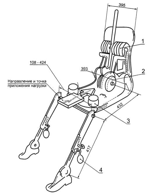 Е.3.3 Конструкция, на которой находятся приспособления для крепления ремня, должна быть жесткой. Верхнее приспособление не должно перемещаться более чем на 0,2 мм в продольном направлении, если к нему приложена в этом направлении нагрузка, равная 98 даН. Тележка должна быть сконструирована таким образом, чтобы в ходе испытаний исключалась возможность возникновения остаточной деформации частей конструкции, несущих приспособления для крепления.