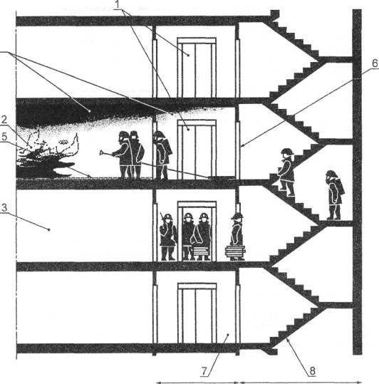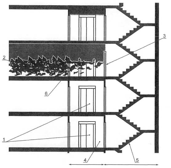 4.3 Опасности, не рассматриваемые настоящим стандартом (см. введение): а) недостаточное число и неправильное размещение в здании лифтов для пожарных; б) блокирование людей в лифтовом холле при отсутствии обслуживания этажа лифтами; в) пожар в шахте лифта для пожарных, в пожарозащищенном лифтовом холле, в помещениях для размещения лифтового оборудования или в кабине лифта; г) разрушение здания прежде, чем пожарные прекратят использование лифта для пожарных; д) отсутствие идентификационных знаков на каждом этаже. 5 Требования безопасности и/или защитные меры5.1 Требования к окружающей среде/зданию5.1.1 Лифт для пожарных должен устанавливаться в пожаробезопасной шахте, и перед шахтной дверью на каждом этаже должен быть пожарозащищенный лифтовой холл. Площадь холла должна определяться с учетом расположения в нем шахтных дверей и маневра с носилками при транспортировании пострадавших (приложения В и Е). При расположении лифта для пожарных в общей шахте с другими лифтами огнестойкость ограждения как общей шахты, так и шахты лифта для пожарных должны быть идентичными. Аналогичные требования к огнестойкости ограждений пожарозащищенных лифтовых холлов, машинных помещений лифтов должны предъявляться при совместном расположении лифтов для пожарных с другими лифтами (приложение В). При отсутствии в общей шахте стены, отделяющей лифт для пожарных от других лифтов, находящихся в этой шахте, все другие лифты, их электрооборудование должны быть защищены от факторов пожара так же, как и лифты для пожарных и их электрооборудование. Ограждающие конструкции шахты лифта для пожарных должны иметь предел огнестойкости не менее REI 120 по СНиП 21-01 [3] и ГОСТ 30247.1. В ограждающих конструкциях шахт допускаются проемы (отверстия) для установки элементов оборудования лифта (аппараты управления, сигнальные устройства и т. п.) и вентиляционных устройств. Ограждающие конструкции пожарозащищенных лифтовых холлов лифта для пожарных должны иметь предел огнестойкости не менее EI 45 (СНиП 21-01 [3] и ГОСТ 30247.1). Ограждающие конструкции машинных помещений лифтов для пожарных должны иметь предел огнестойкости не менее REI 120 (СНиП 21-01 [3] и ГОСТ 30247.1). Шахтные двери, двери лифтовых холлов и двери машинных помещений лифтов для пожарных должны иметь следующие пределы огнестойкости: - двери шахт - не менее EI 60 (СНиП 21-01 [3] и ГОСТ 30247.3); - двери лифтовых холлов - не менее EI 30 (СНиП 21-01 [3] и ГОСТ 30247.2); - двери машинных помещений - не менее EI 60 (СНиП 21-01 [3] и ГОСТ 30247.2). Двери лифтовых холлов должны иметь дымогазонепроницаемое исполнение, устройства самозакрывания и уплотнения в притворах. Если лифт для пожарных размещается в отгороженной от других лифтов шахте (при наличии разделительной стенки шахты с пределом огнестойкости, соответствующим пределу огнестойкости ограждения шахты лифта для пожарных), предел огнестойкости ограждения шахт других лифтов, а также дверей шахт этих лифтов должен быть соответственно не ниже EI 45 (СНиП 21-01 [3] и ГОСТ 30247.1) и Е30 (СНиП 21-01 [3] и ГОСТ 30247.3). Вышеизложенные пределы огнестойкости для ограждающих конструкций шахт, машинных помещений и лифтовых холлов лифтов для пожарных, также как и пределы огнестойкости шахтных дверей, дверей машинных помещений и лифтовых холлов, действительны для жилых зданий высотой до 75 м, зданий других классов функциональной пожарной 