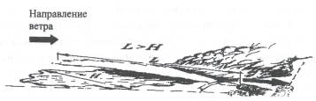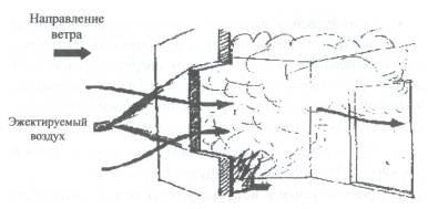 Рис. 2. Схема применения устройства для удаления дыма способом эжекции 3.3. Тушение пожаров в замкнутых объемах Наибольшие возможности работы устройств проявляются при тушении в ограниченных замкнутых объемах (квартирах, подвалах, чердаках и т.п.). Как правило, в горящих помещениях происходит сильное задымление, не позволяющее в полной мере визуально оценить обстановку. Поэтому тушение в данных условиях проводят в следующем порядке: - осуществляют осаждение дыма и снижение среднеобъемной температуры; - определяют источники открытого пламени и производят их тушение. Если источник горения хорошо различим, то тушение лучше начинать сразу компактной струей, не затрачивая время на действия по осаждению дыма. Наиболее эффективно тушение устройствами по площади при угле распыла факела 60° и на расстоянии от очага пожара менее 3 м. 3.4. Тушение деревянных конструкций Начинать тушение деревянных конструкций нужно с минимально возможной дистанции, постепенно сокращая расстояние до очага горения. На открытых пространствах начинать тушение следует с учетом направления ветра, по мере уменьшения размеров и интенсивности очага пожара обеспечить пролив со всех сторон. Эффективность тушения тлеющих материалов во многом зависит от скорости подачи капель в очаг пожара, поэтому при первой возможности необходимо максимально приблизиться к нему. Тушение вертикальных штабелей тлеющих материалов начинать лучше с нижнего уровня, так как образующийся водяной пар поднимается вверх, тем самым увеличивая эффективность использования воды, и создает зону локального объемного тушения. 3.5. Тушение проливов горючей жидкости В случае аварии при транспортировке, хранении либо технологической переработке ЛВЖ возможны их проливы на грунт и образование горящих луж. Как правило, тушение проливов ЛВЖ осуществляется пеной. С использованием струйных систем при определенных размерах горящих луж ЛВЖ и направлении ветра возможно тушение водой способом «срезания» пламени. Основным условием для этого является поперечный по отношению к направлению ветра размер пролива, который не должен быть больше дальности распыленной струи. Распыленную струю воды направляют поперек движения ветра перед горящей лужей на высоту, позволяющую перекрыть весь пролив, и перемещают вдоль направления движения ветра от начала до конца источника горения. При этом водяное облако сбивает пламя и отсекает его по мере перемещения от потушенной поверхности ЛВЖ. Возможно «срезание» пламени двумя одновременно работающими стволами, располагаемыми с двух сторон лужи и подающими струи навстречу друг другу, при ширине пролива большей, чем длина струи, или при других неблагоприятных условиях (рис. 3). При использовании раствора пенообразователя тушение рекомендуется начинать с края горящего пролива, постепенно вытесняя фронт огня. Применяя фторированные пенообразователи, можно направлять струю в центр пролива и не прекращать подачу ОТВ до того момента, пока раствор пенообразователя не затянет пленкой всю поверхность. Нужно также учитывать высокую скорость подачи ОТВ. Управление стволом должно быть плавным, чтобы не разбрызгивать горючую жидкость и не допустить проскока пламени. При тушении ЛВЖ с близких расстояний в первый момент подачи ОТВ нужно быть готовым к импульсивному выб