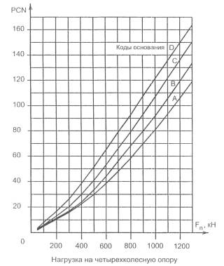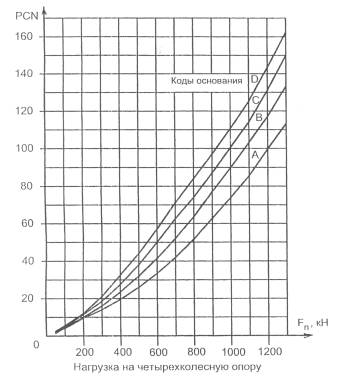 Значение PCN можно определить по графику рис. 1.1 и рис. 1.2 в зависимости от кода прочности грунтового основания и величины допустимой нормативной нагрузки на четырехколесную опору (табл. 1.3)