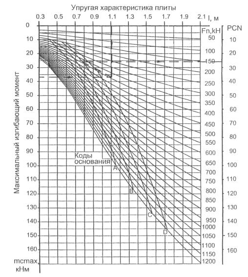 tpd - толщина жесткого слоя покрытия, принимаемая в зависимости от категории разрушения. При расчете эквивалентного однослойного покрытия о характеристики материалов, типы швов и стыковых соединений принимают как для существующего покрытия; - значение коэффициента kd уменьшают на 15 % по сравнению с данными, приведенными в табл. 30 /2/, но принимают не менее 1; - коэффициент условий работы устанавливают с учетом поправочного коэффициента km определяемого по графику приложения 10 /2/ в зависимости от толщины асфальтобетона. 1.2.5. Определение допустимой нагрузки и кода PCN по номограммамПроцесс поиска допустимой нагрузки затрудняется тем, что на каждом шаге необходимо определять единичные изгибающие моменты по таблице интерполяцией. Для определения допустимой нагрузки и кода PCN разработаны номограммы максимальных изгибающих моментов (рис. 1.3…1.5) конструкций аэродромов с жёсткими и смешанными покрытиями. С помощью номограмм можно найти величину нагрузки, для которой выполняется равенство расчетного и предельного моментов. Номограммы построены для стандартной четырехколесной опоры с расстояниями между смежными колесами 0,7 м и между рядами колес - 1,3 м. Для определения допустимой нагрузки по номограммам рис. 1.3...1.5 необходимо: 1) определить жесткость конструкции; 2) определить эквивалентный коэффициент постели упругого основания; 3) вычислить упругую характеристику плиты; 4) определить суммарную толщину жесткой конструкции; 5) определить расчетное сопротивление растяжению при изгибе цементобетона; 6) вычислить предельный изгибающий момент; 7) вычислить максимальный изгибающий момент по формулам (1.19)...(1.26); 8) восстановить перпендикуляры - из точки на горизонтальной оси, соответствующей значению упругой характеристики плиты; - из точки на левой вертикальной оси, соответствующей значению максимального изгибающего момента, до их пересечения. Полученная точка пересечения определяет на кривых линиях допустимую нагрузку на нормативную четырехколесную опору. Например, для упругой характеристики плиты, равной 1,11 м, и максимального изгибающего момента, равного 37 кНм/м (рис. 1.3), допустимая нагрузка составит 390 кН. Для определения численного значения PCN необходимо определить код основания по табл. 1.1 в зависимости от эквивалентного коэффициента постели. Код PCN находят по номограммам, проводя кривую линию, интерполирующую допустимую нагрузку, от найденной выше точки пересечения (величины допустимой нагрузки) до пересечения с графиком требуемого кода основания. От последней точки пересечения проводят прямую горизонтальную линию до правой оси (PCN). Код допустимого давления принимают по табл. 1.2 в зависимости от класса прочности бетона верхнего слоя покрытия. Например, по рис. 1.3 можно найти: при допустимой нагрузке 390 кН, коде основания С и классе прочности бетона 3,6/45 код PCN 26\R\C\X\T. 1.2.6. Вычисление максимального изгибающего моментаМаксимальный изгибающий момент можно вычислить, приравняв расчетный и предельный изгибающий моменты, т.е. выполнив условия (1.5) или (1.6)...(1.7). Для двухслойных покрытий вычисляют значения максимальных изгибающих моментов по условиям прочности верхнего и нижнего слоев и принимают наибольшее значение. Ниже приведены формулы для вычисления изгибающих моментов: для однослойных покрытий для бетонных и армобетонных однослой