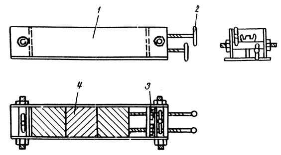 Рис.3. Зависимость прочности склеивания бетонных образцов от температуры: 1-прочность образцов при изгибе больше 28 кГ/см2; 2-разрушение контрольных образцов по бетону При обогреве клея в стыке сетками закладывают шесть образцов на каждый стык. Контрольные образцы склеивают на месте строительства тем же составом клея, что и монтируемый стык, обжимают в специальном приспособлении (рис.4) и помещают в сушильный шкаф или камеру для прогрева образцов (рис.5). Температура и время прогрева контрольных образцов и стыка в конструкции должны быть одинаковы.