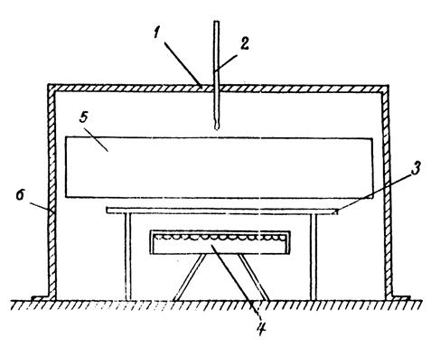 Рис.4. Приспособление для обжатия контрольных образцов: 1-стандартные формы для изготовления образцов (призм или кубов 10×10×10; 15×15×15 см); 2-винты для обжатия склеиваемых образцов диаметром 10-12 мм; 3-гайки, привариваемые к торцовой перегородке форм под винты; 4-клееные контрольные образцы Рис.5. Схема термошкафа для прогрева контрольных образцов: 1-утепление из асбеста или нескольких слоев толя; 2-термометр; 3-металлический столик; 4-электроплитка; 5-контролвные образцы в приспособлении для обжатия; 6-короб из жести, фанеры, досок ПРИГОТОВЛЕНИЕ И НАНЕСЕНИЕ КЛЕЯ НА СТЫКУЕМЫЕ ПОВЕРХНОСТИ БЛОКОВ19. Приведенные составы (см. табл. 2, 3) являются ориентировочными (свойства смолы, пластификатора и отвердителя меняются со временем) и подлежат корректировке в построечной лаборатории. Свойства клея корректируют изменением количества отвердителя в его составе. Увеличение количества отвердителя уменьшает жизнеспособность клея, а уменьшение - увеличивает. 20. Вязкость клея регулируют изменением количества наполнителя исходя из погодных условий и способа нанесения клея (кистью, шпателем» сжатым воздухом). Вязкость клея подбирают такой, чтобы он легко наносился на стыкуемые поверхности блоков пленкой необходимой толщины и вместе с тем хорошо удерживался на них, не стекая. Чтобы уменьшить отекание клея с вертикальных поверхностей, в состав клея, кроме наполнителя, вводят тиксотропные добавки (аэрозоль, сажу, молотый асбест и т.д.) в количестве 3-10 весовых частей на 100 весовых частей эпоксидной смолы. 21. Клеи № 1 и 2 (см. табл. 3) наносят на разогретые поверхности блоков (температура 15÷30°С); клей № 3 наносят на холодные поверхности. Температура блоков к моменту нанесения клея не должна превышать 5°С. 22. В состав эпоксидных клеев входят следующие компоненты: а) эпоксидная смола ЭД-5, пластифицированная полисульфидом; б) пластификатор (дибутилфталат, фуриловый спирт). Пластификатор вводят в состав клея для снижения вязкости смолы и увеличения количества наполнителя, уменьшения хрупкости клеевого шва, повышения сопротивления клея старению. Пластификаторы, как правило, являются также модифицирующими добавками, придающими клею дополнительные положительные свойства. Фуриловый спирт, например, позволяет склеивать влажные бетонные поверхности без специальной обработки их перед склеиванием и не увеличивает при этом время на полимеризацию клея, позволяет свободно наносить этот состав клея на бетонные поверхности, имеющие отрицательную температуру; в) отвердитель (полиэтиленполиамин); г) ускоритель твердения (хлорное железо, солянокислый анилин); д) наполнитель (цемент, молотый кварцевый песок и др.). Увеличение количества наполнителя в составе клея до 600 весовых частей не снижает его прочностных свойств, но уменьшает расход эпоксидной смолы, снижает хрупкость клеевого шва, повышает сопротивление клея старению; е) тиксотропная добавка (аэрозоль, сажа, молотый асбест и др.). 23. Все продукты, входящие в состав клея, выпускаются промышленностью, поставляются потребителю в готовом виде и имеют заводские паспорта (табл. 4). Может быть предусмотрена поставка смолы с пластифицирующими добавками в виде готового компаунда. 24. Химикаты, входящие в состав эпоксидного клея, хранят в сухом прохладном помещении (температура от 0 до 20°С), предназначенном для хранения огнеопас
