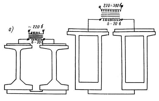 Рис.1. Схемы прогрева стыков в балках таврового (а), двутаврового (б) и коробчатого (в) сечений спиралями