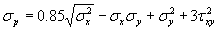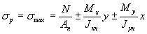 где х, у - главные оси рассматриваемого сечения; N - продольное усилие; Мх, Му - изгибающие моменты; Ап - площадь поперечного сечения нетто; Jxn, Jyn - моменты инерции поперечного сечения нетто. При объёмном напряжённом состоянии в качестве расчётного напряжения принимается интенсивность напряжений. Для плоского напряжённого состояния, характерного для тонкостенных профилей: уголка, швеллера, двутавра, а также листовых и оболочечных элементов, интенсивность напряжений (с обязательным понижающим коэффициентом) вычисляется по формуле: